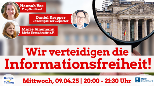 Webinar zur Verteidigung unseres Informationsfreiheitsgesetzes von Europe Calling e.V. in Kooperation mit Mehr Demokratie e.V. am Mittwoch, 9. April, 20.00-21.30 Uhr.